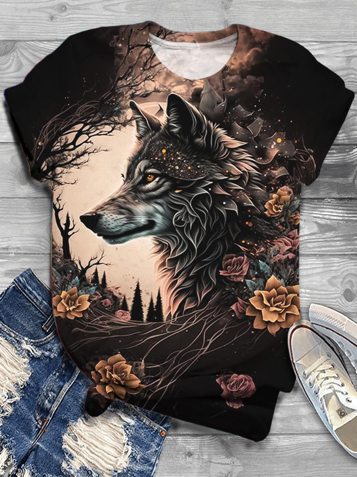 Floral Wolf Print Round Neck Short Sleeve T-Shirt