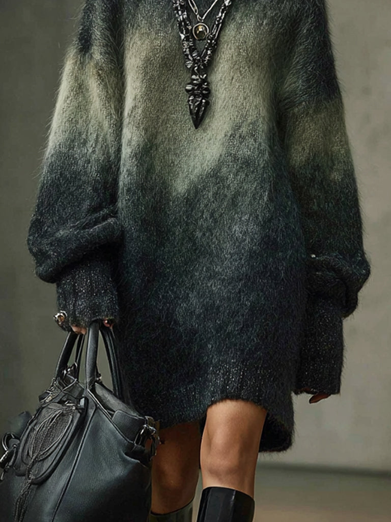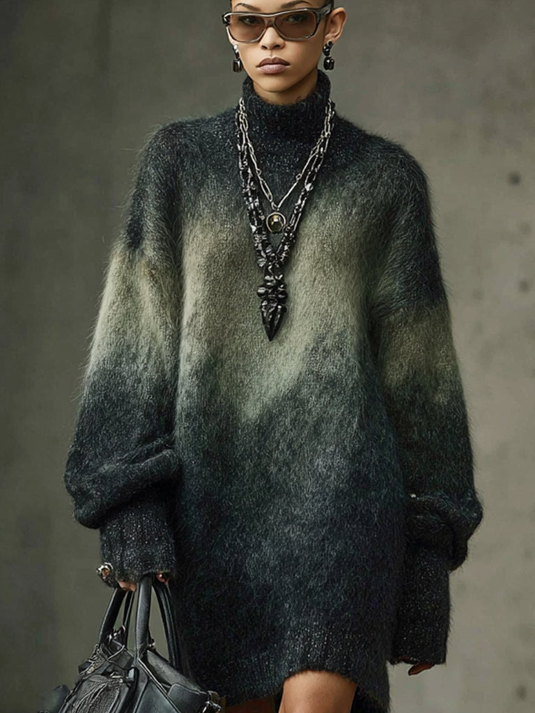 This gradient faux mink knit dress is a masterful blend of softness and statement. With its dramatic color fading and smoky visual texture, it channels modern minimalism with a touch of gothic romance. The oversized structure and comforting warmth make it effortlessly stylish for cooler seasons. Pair it with tall leather boots, layered metallic accessories, and a structured handbag for an elevated yet easygoing look that turns heads wherever you go.