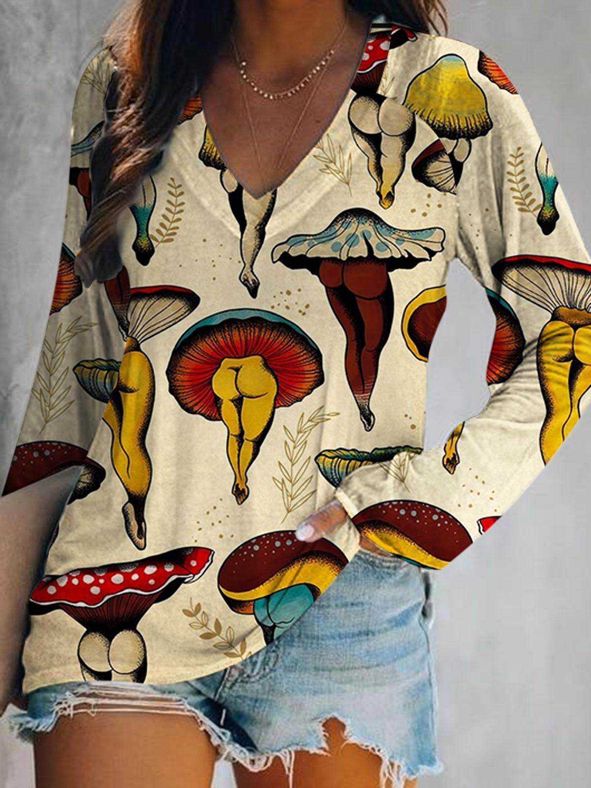 Funny Mushroom Retro Print V-Neck Long Sleeve Top