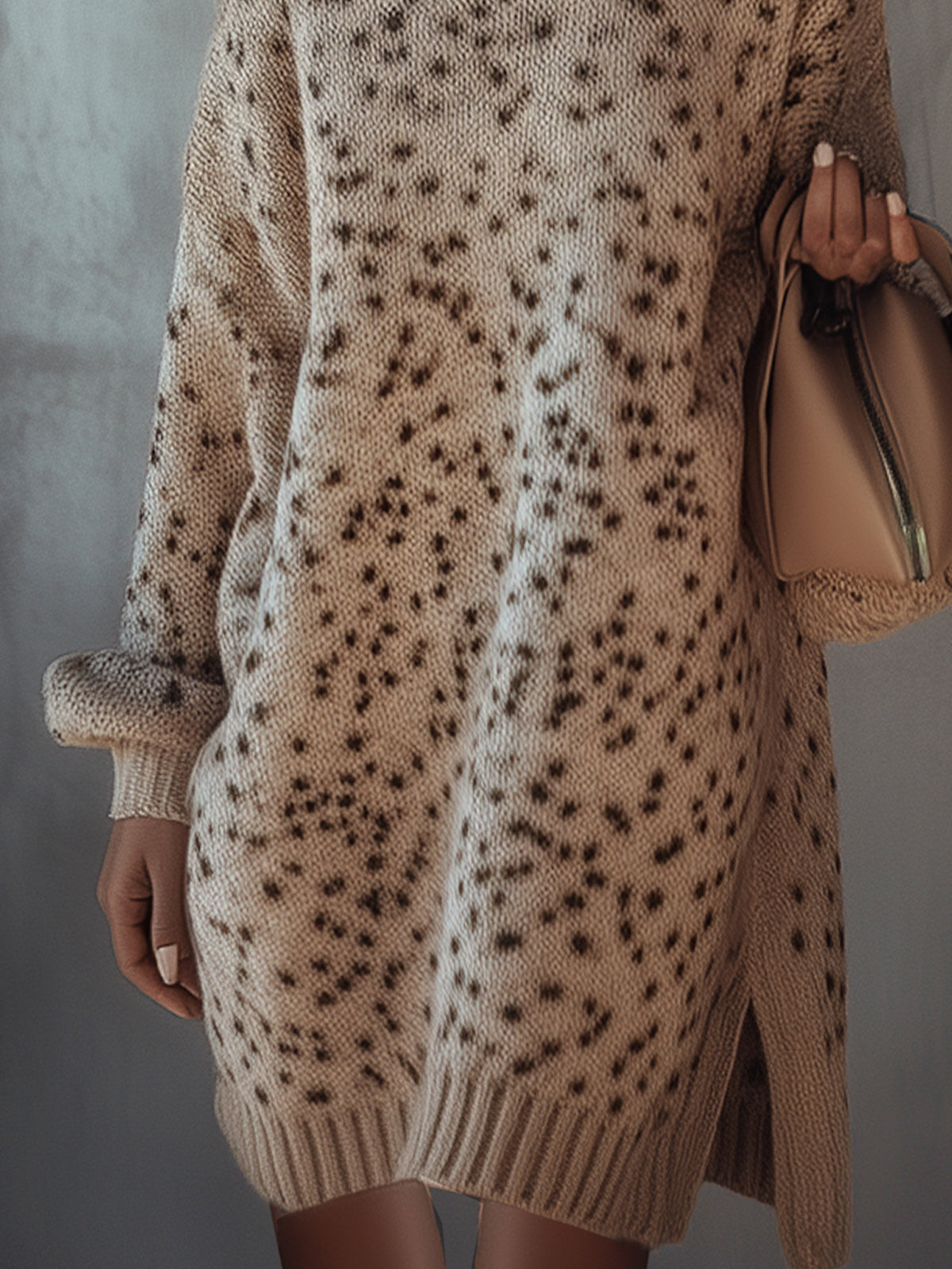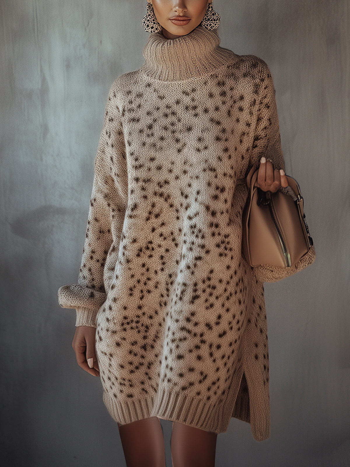 Design: A light beige dress adorned with delicate dark speckles, featuring a classic turtleneck, long sleeves, and a relaxed fit for effortless elegance.