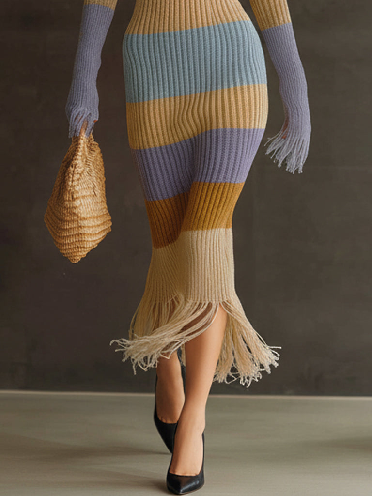 Effortlessly chic and filled with artistic flair, this striped knit midi dress stands out with its unconventional color palette and fringe-trim accents. The blend of earthy mustard, muted lavender, dusty blue, and cream hues brings a rich palette that works for both spring and autumn. Styled with a woven tote and delicate layered jewelry, this dress bridges cozy comfort with boho-meets-modern fashion.