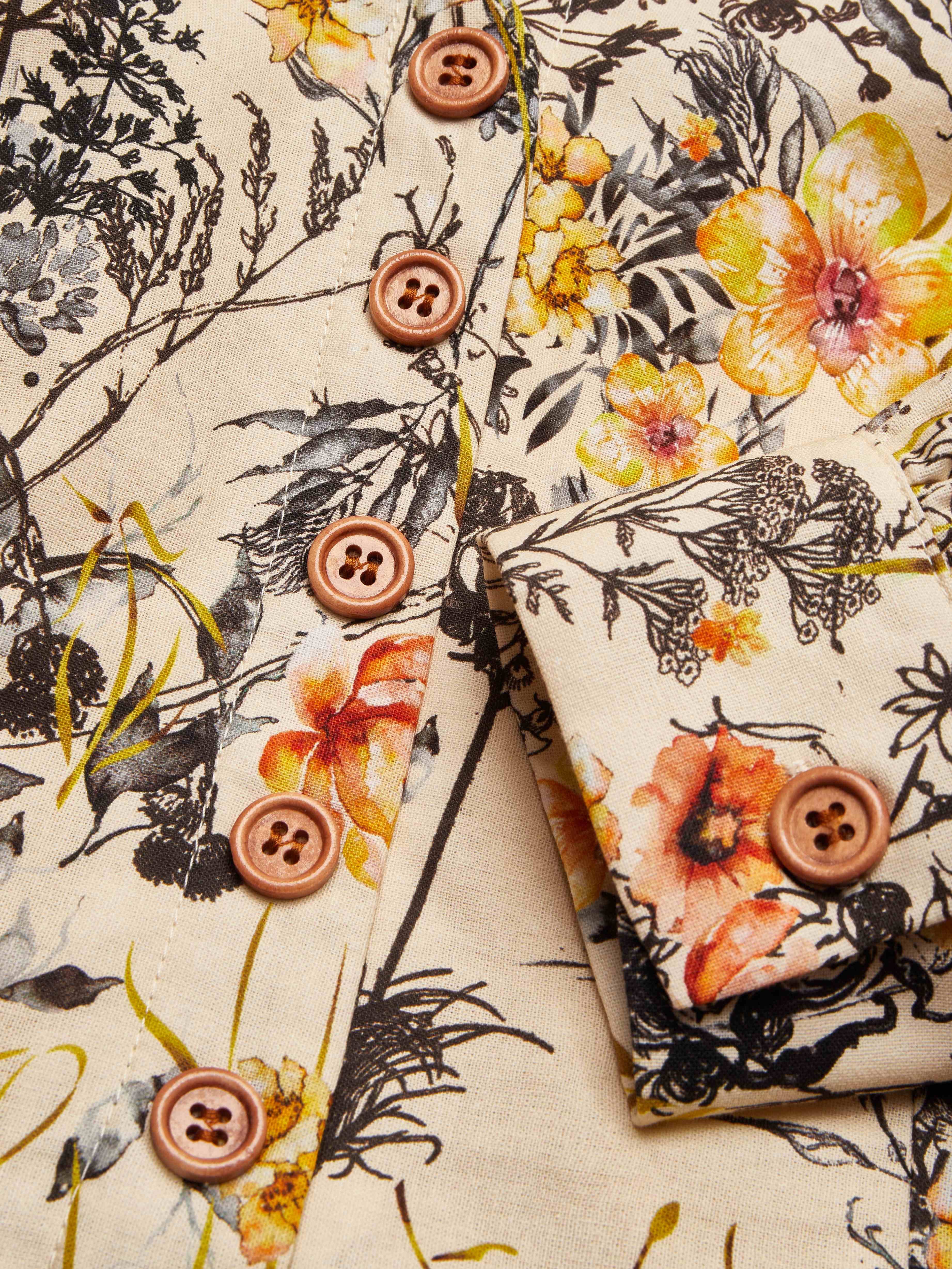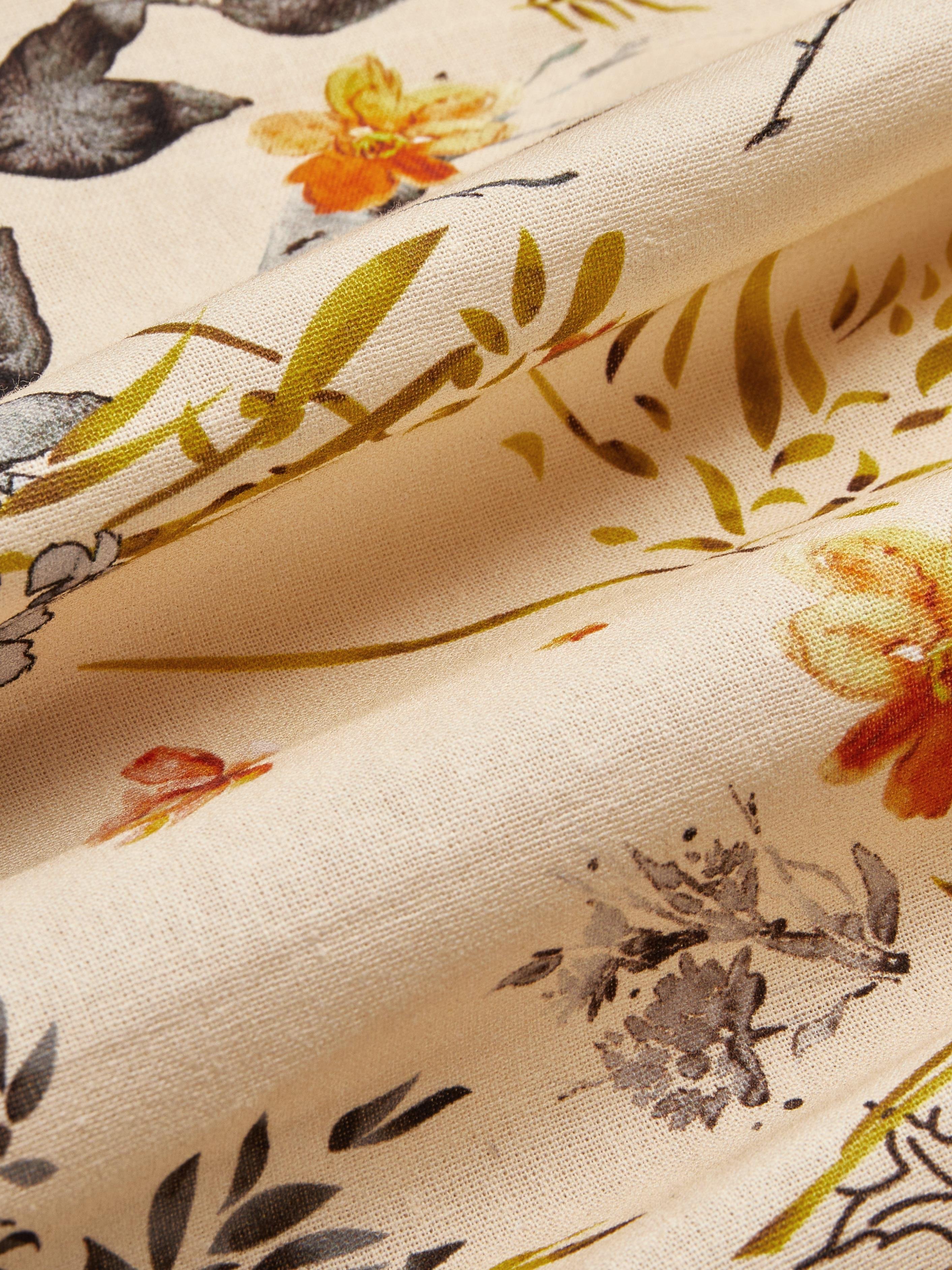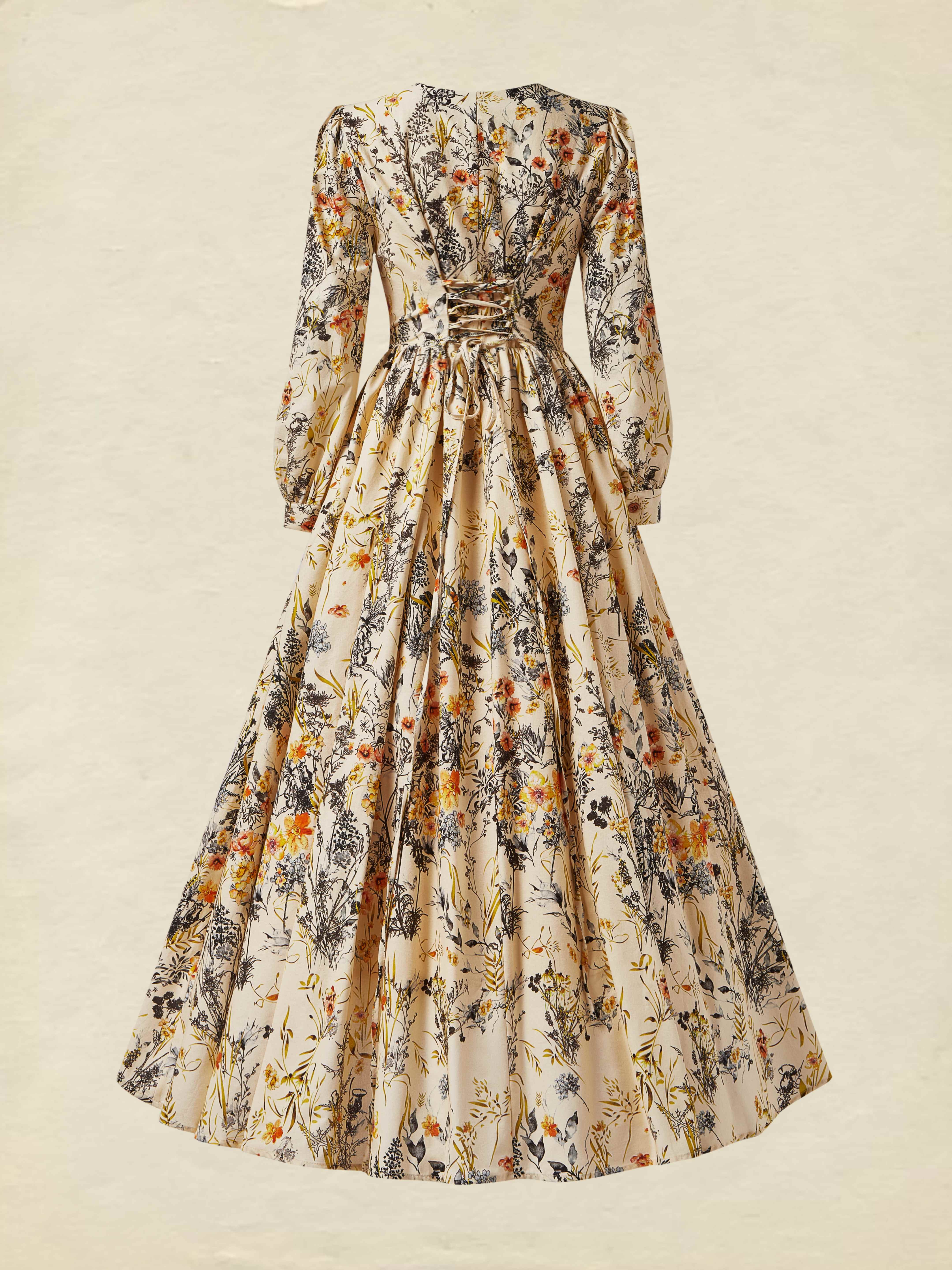 Linen Maxi Dress, Long Sleeves, V Neck, Floral, Apricot,Daily
