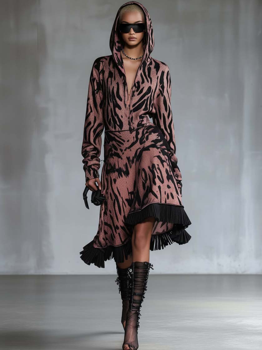 This pink hooded midi dress merges sporty and feminine elements through its sweatshirt-inspired top and ruffled skirt. The animal-like print adds a bold, contemporary edge, while the pleated black trim enhances movement and sophistication. The hood detail modernizes the look, giving it a casual yet runway-ready feel.