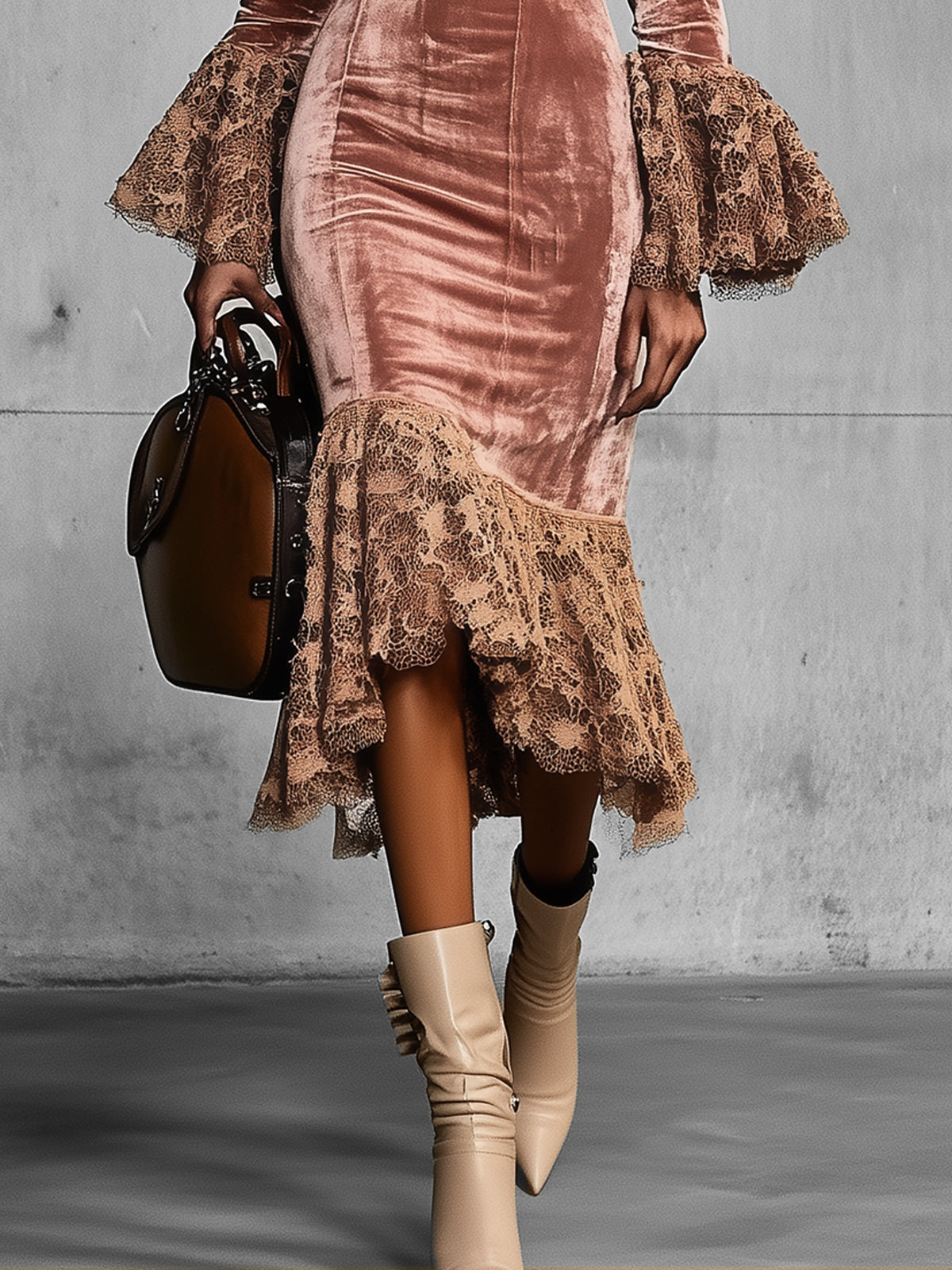 2. Design: Soft blush velvet with intricate lace trim, featuring a plunging neckline, dramatic puffed shoulders, and flared lace cuffs and hem.