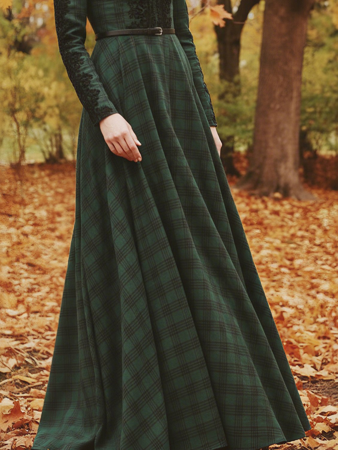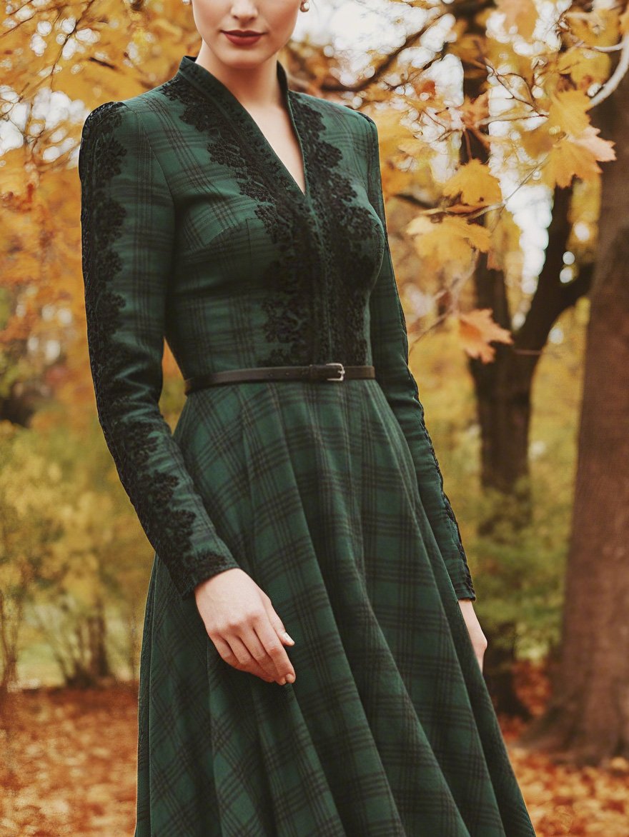 Maxi Linen Dress, Long Sleeves, V Neck, Plaid, Lace, Vintage, Deep Green