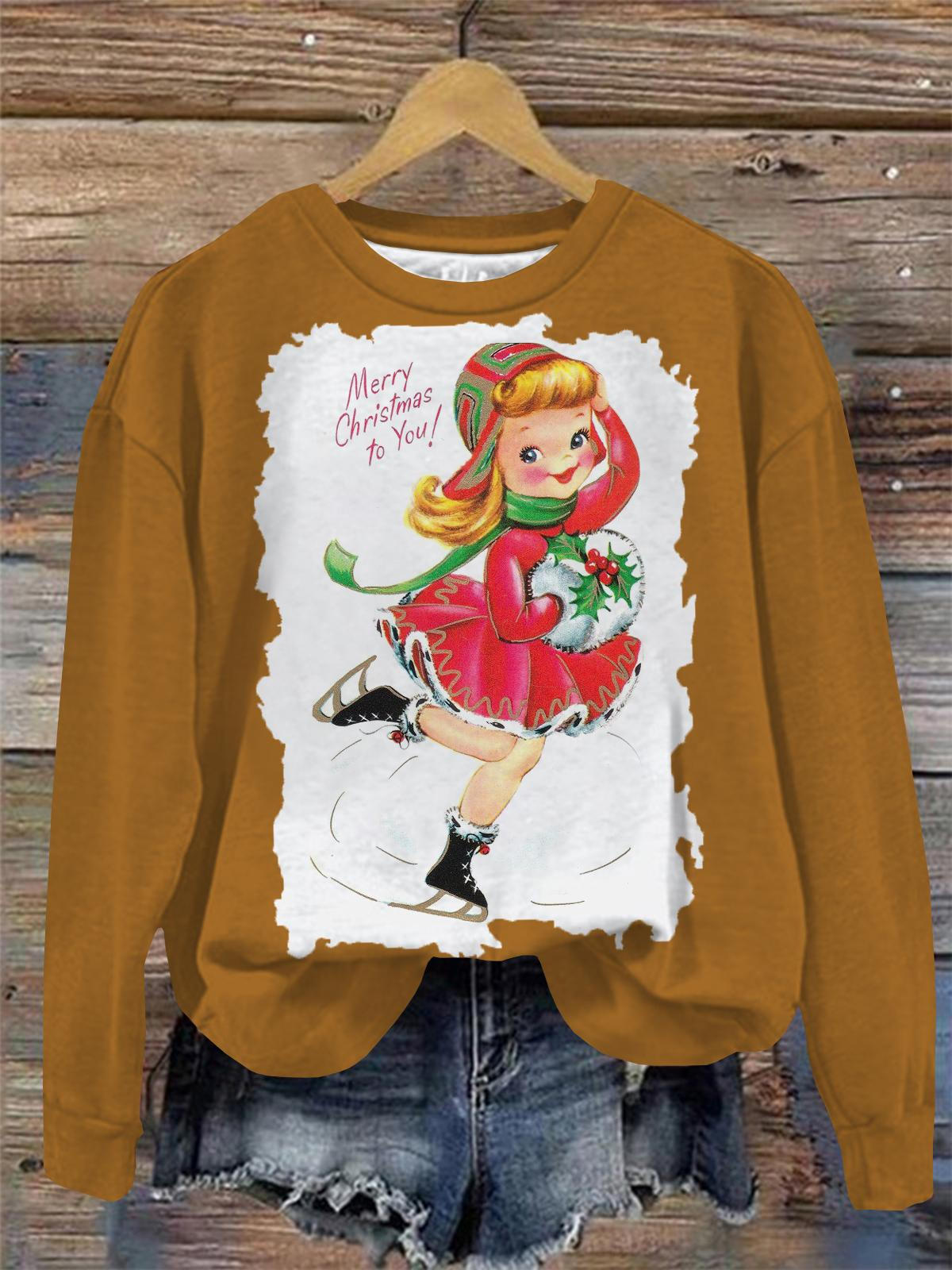 Skate Girl Christmas Print Round Neck Long Sleeve Top