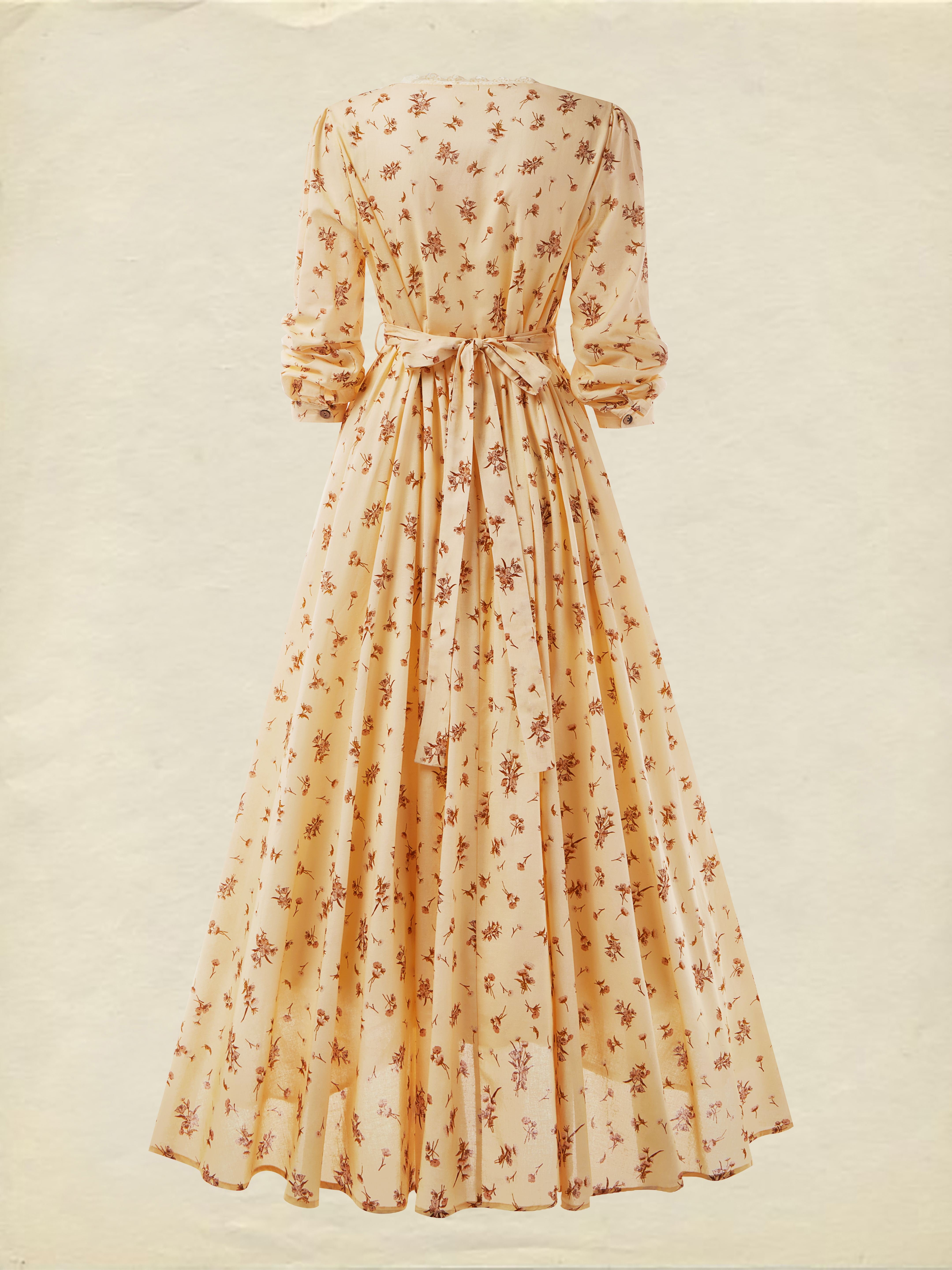 Maxi Linen Dress, Long Sleeves, V Neck, Cottagecore, Linen Blend, Apricot