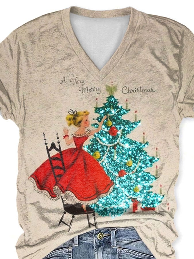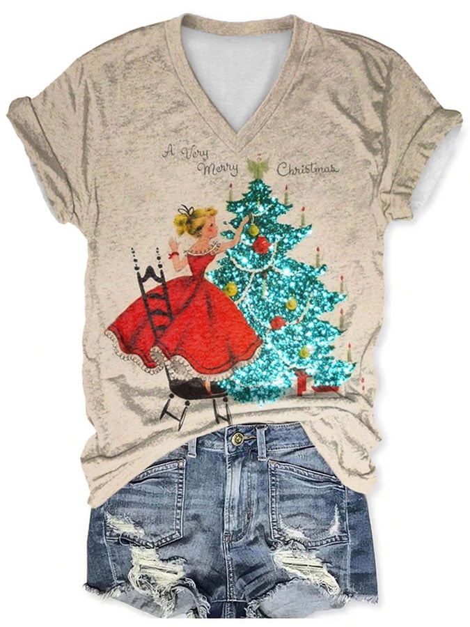 V-Neck Retro A Very Merry Christmas Print T-Shirt