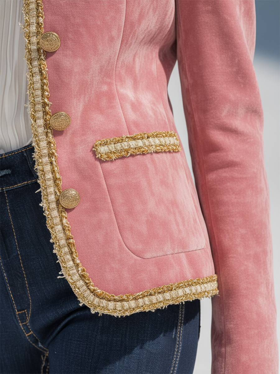 For styling, pair it with high‑waisted trousers or a satin slip skirt for an elevated look, or layer it over a simple turtleneck and jeans to bring luxe texture to a casual outfit. Gold earrings or a delicate chain complement the trim without overpowering it. Finish with ankle boots or pointed heels to complete the look. Ideal for evening outings, gallery events, or festive gatherings, this jacket captures timeless glamour with effortless grace.