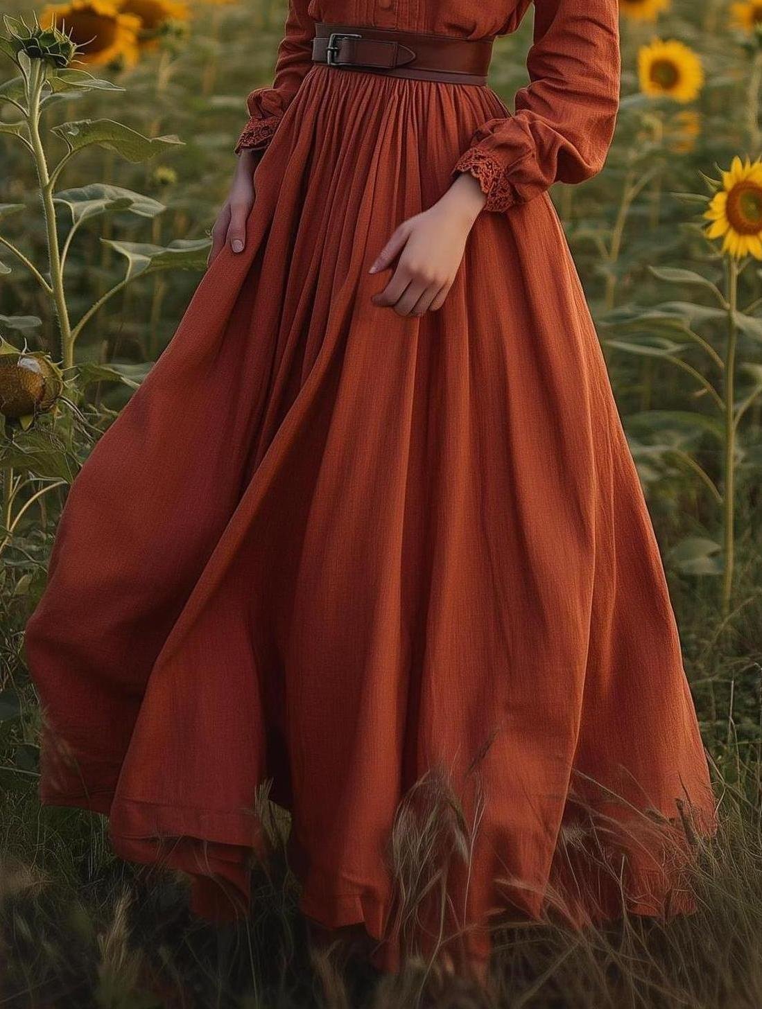 Maxi Linen Dress, Long Sleeves, Stand Collar, Shirt Dress, Linen Blend, Orange