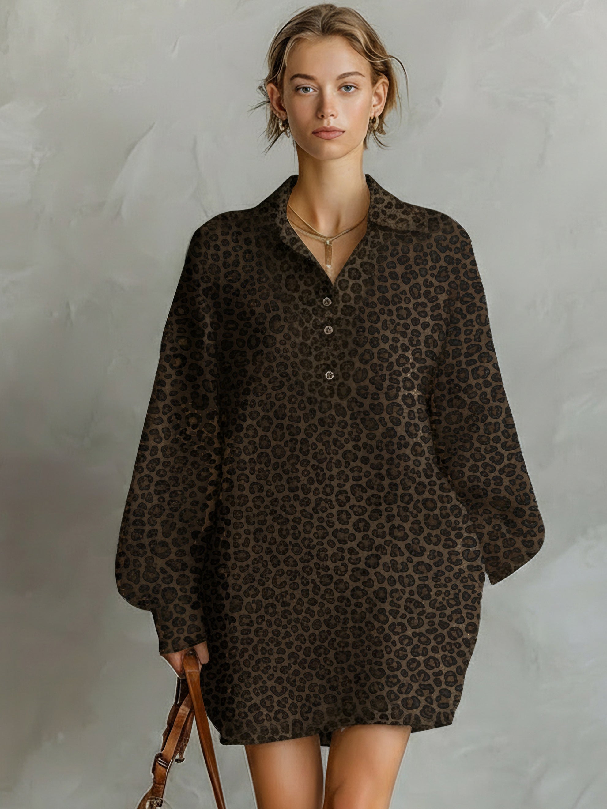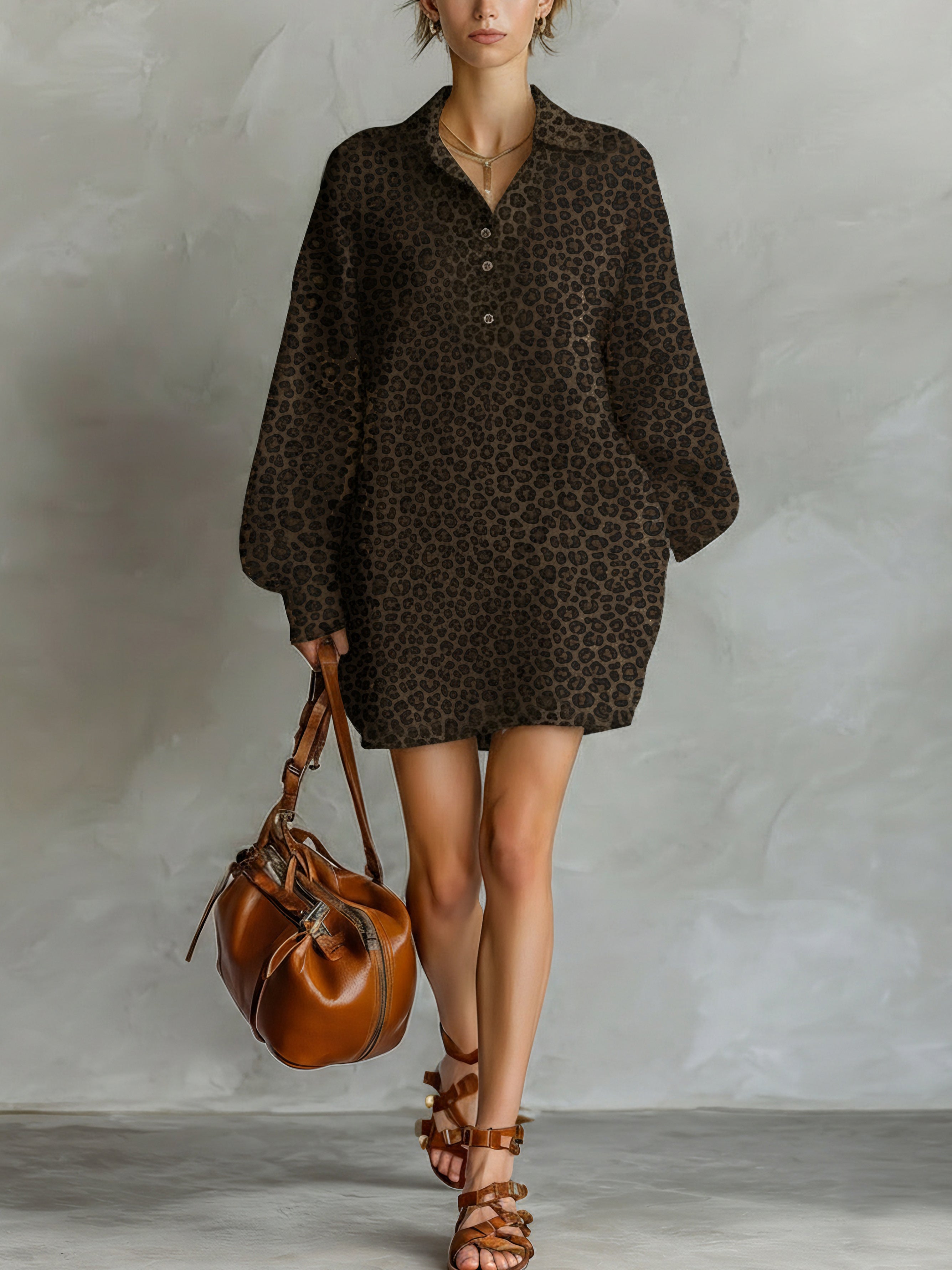 Description: A stylish brown dress featuring a bold leopard print and a relaxed silhouette. Designed with an open neckline and long sleeves, it offers an effortlessly fashionable look with a comfortable, laid-back feel.