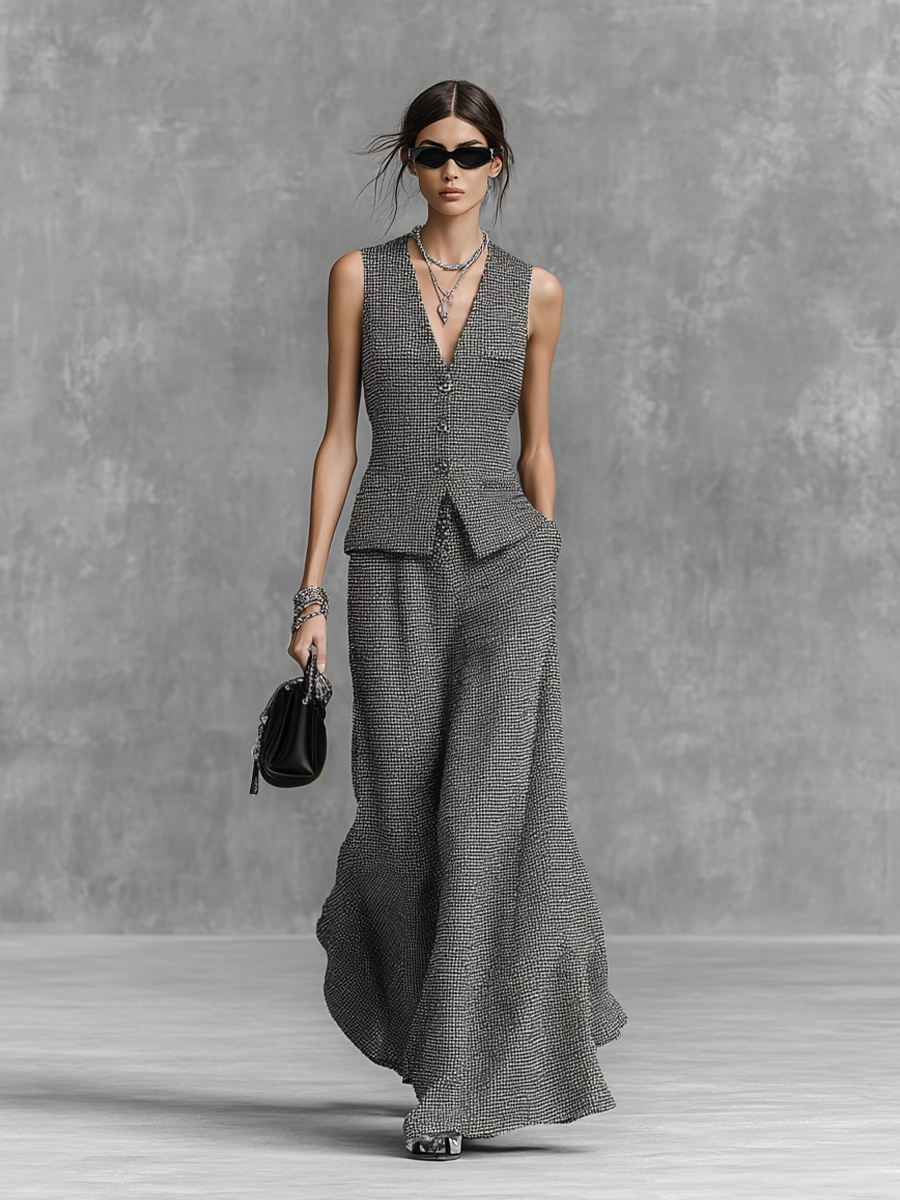 This elegant grey tweed set features a sophisticated sleeveless V-neck vest and a matching flowing maxi skirt, crafted from luxurious woven tweed fabric. The fitted vest with button detailing offers a sharp silhouette, while the high-waisted, wide-flared maxi skirt creates a graceful and dramatic look. Perfect for making a statement at upscale events, formal gatherings, or a chic professional setting.
