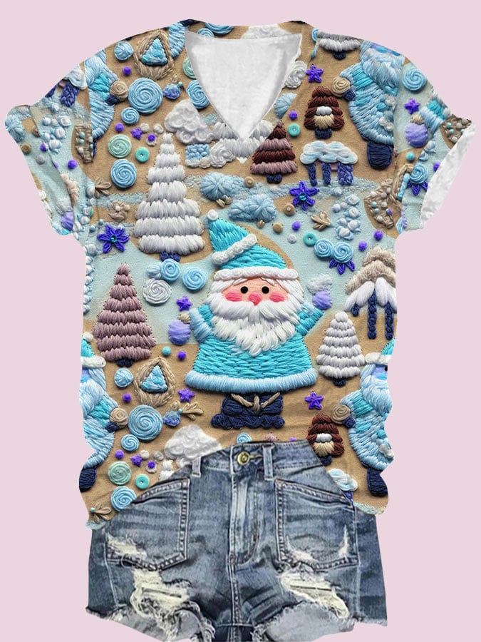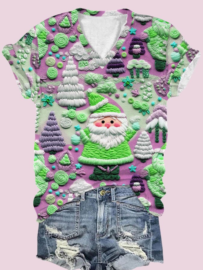 Women's Pink Santa Claus Print V-Neck T-Shirt