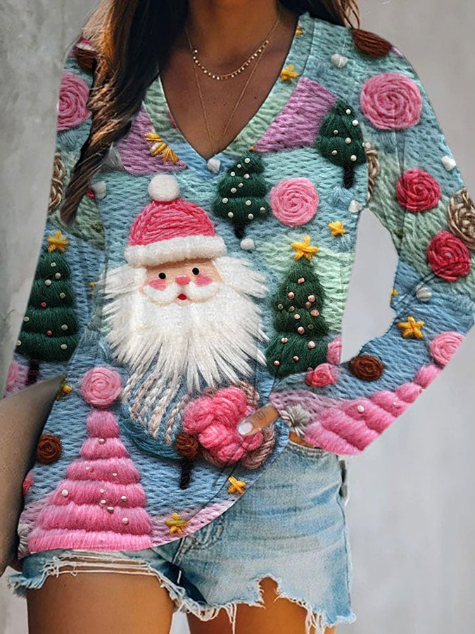 Women's Pink Santa Print V-Neck T-Shirt