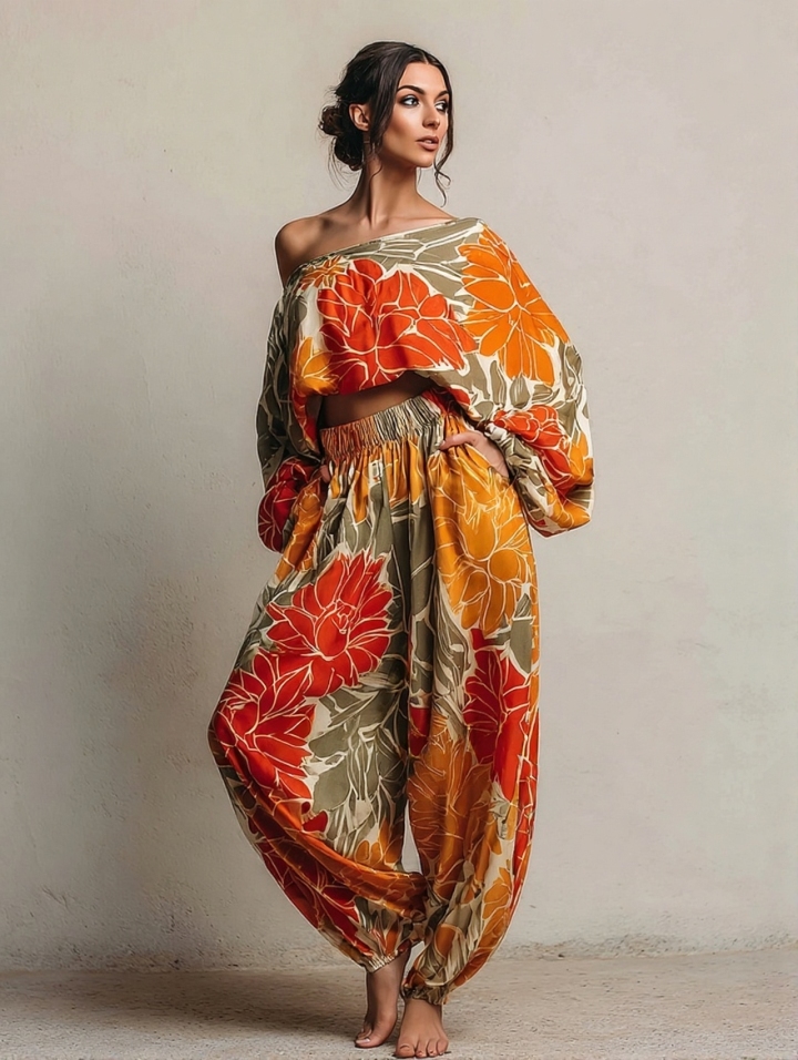 Embrace artistic ease in this vintage-inspired two-piece set, featuring an all-over botanical print on soft, breathable fabric. The relaxed-fit top with delicate button details pairs effortlessly with wide-leg trousers, creating a fluid silhouette perfect for creative days. Designed for both comfort and style, this set transitions seamlessly from studio sessions to casual gatherings. The muted color palette and artistic motifs evoke a nostalgic, bohemian charm, while hidden pockets add subtle functionality. Ideal for writers, artists, or anyone who values thoughtful design and unrestrained movement in their daily wear. Machine washable.