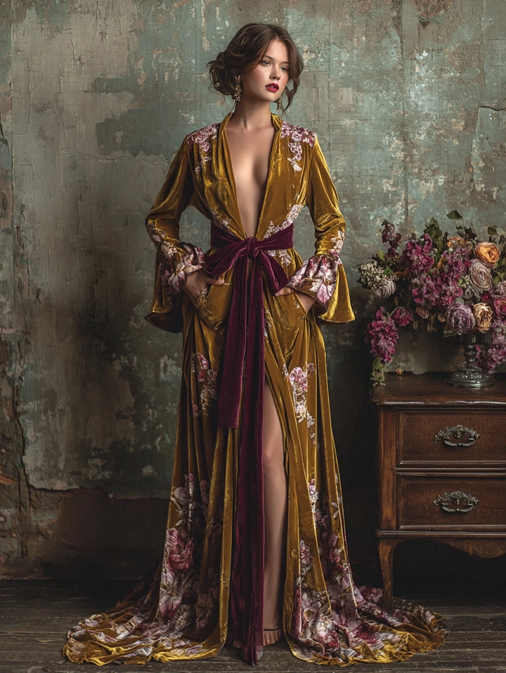 Indulge in luxurious warmth with our Noble Plush Robe, featuring exquisite vintage floral patterns on premium soft velvet. This elegant full-length robe boasts a relaxed fit that drapes gracefully, offering both comfort and sophisticated style. Delicate embroidery and a notched collar enhance its regal charm, while the hidden inner belt allows for adjustable shaping. Perfect for winter relaxation or intimate gatherings, this robe combines cozy insulation with timeless beauty. Wrap yourself in opulent softness and experience the perfect blend of aristocratic elegance and modern comfort.