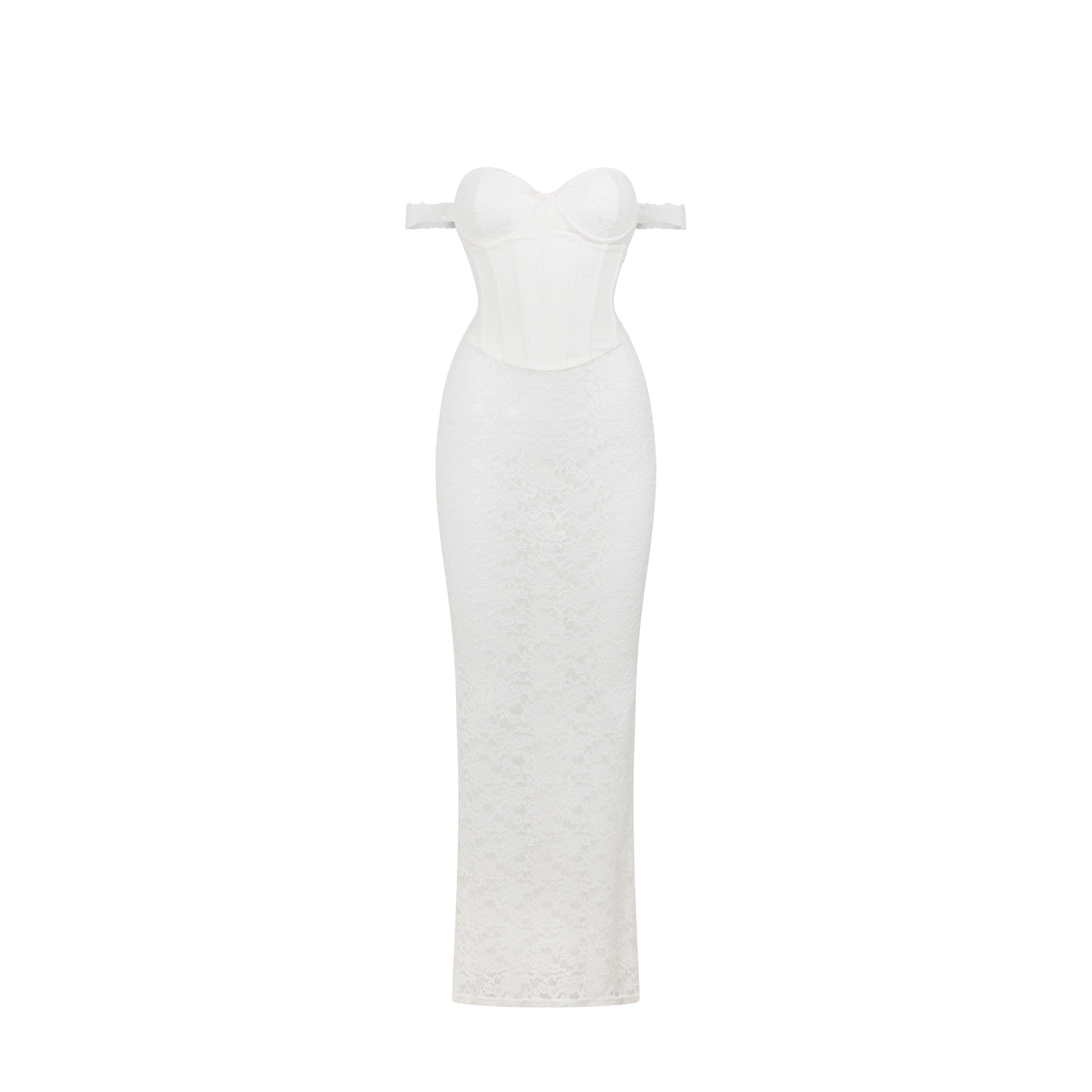 Cut from an Outcast exclusive floral lace fabrication, we're obsessed with the contoured corset feature that is complete with a lace up back for a vintage feel. Zana has delicate lace off-the-shoulder straps to give the illusion of an elongated décolletage, along with an invisible zip closure at the side for easy on-off. She falls freely to a floaty finish with her sheer lace fabrication.